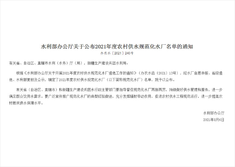 8月,公司承建的福建省柳泉模块化净水厂,入选“水利部2021年度农村供水规范化水厂名单”。